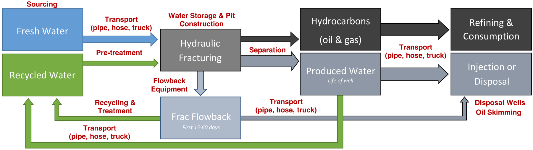 Up to 50% of the fluids pumped during the fracking process returns as flowback water during the first 4-6 weeks of production. A large percentage of the remainder, plus pre-existing formation water, is recovered as produced water over the life of the well.
